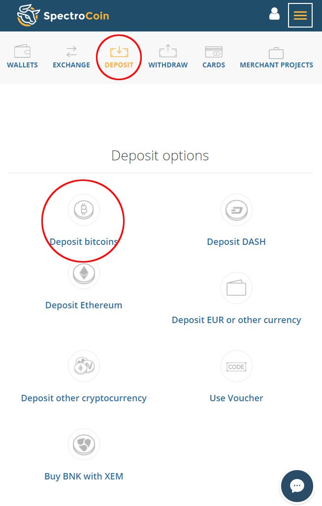 上部メニューの「deposit」を選択しましょう。ここから仮想通貨の入金ができますよ。